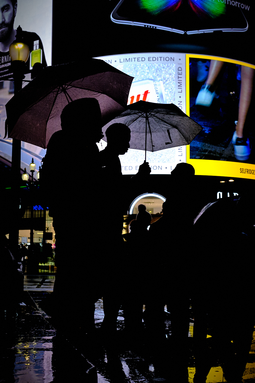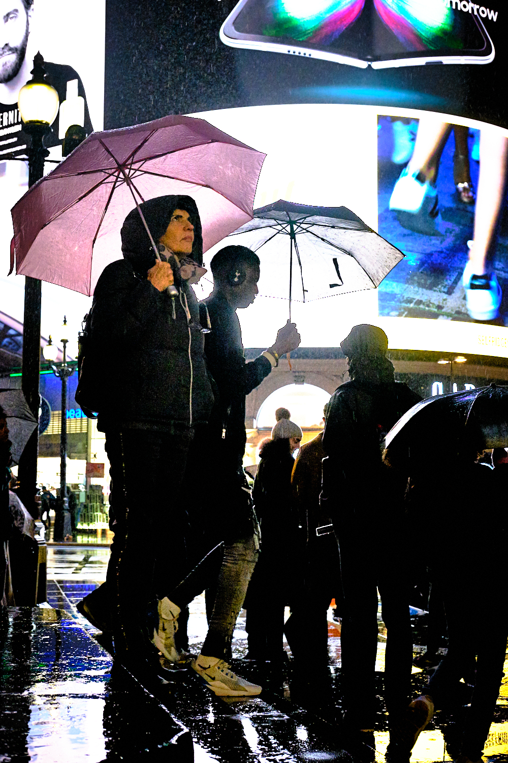 The two images above were taken in London on a wet winters night. The top one you can see I like to capture silhouettes and drama. With the bottom one, I’ve opened up the shadows increased the exposure where you can make out who they are. What one do you prefer whats the story being captured? Had this been exposed for the two people would this give the viewer something to be engaged with the photographer. Do the silhouettes against the bright neon lights hold the viewer in with what’s happening in this composition what is it the photographer what you to see?